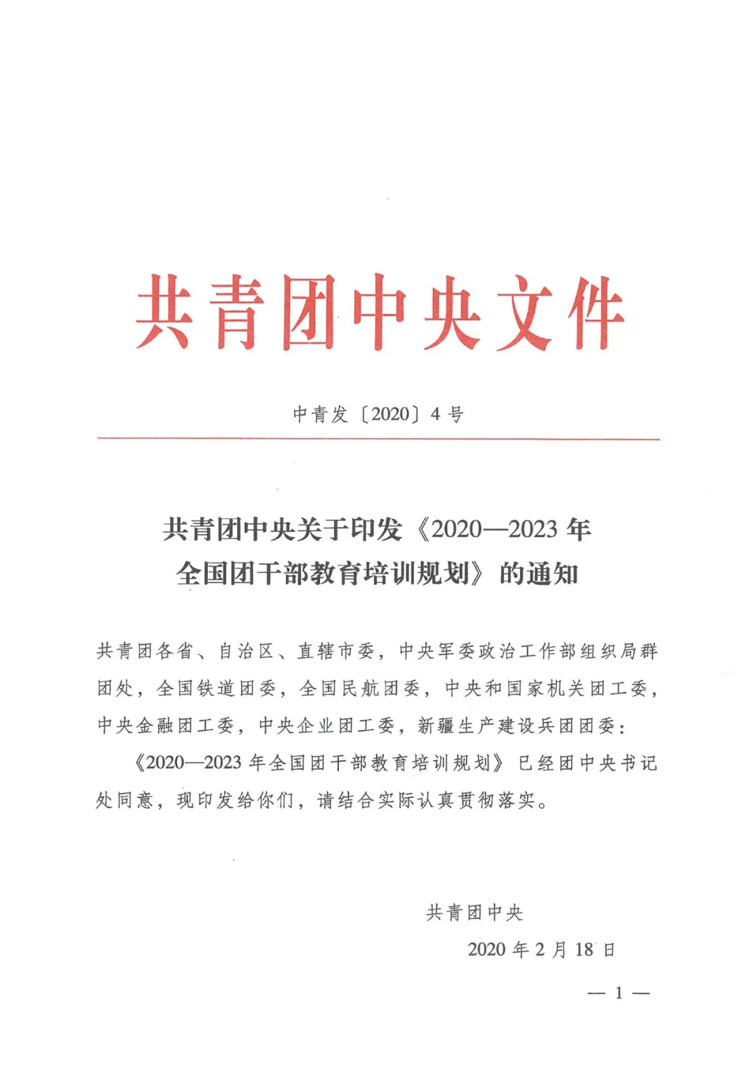 近日,共青团中央印发《2020-2023年全国团干部教育培训规划》(以下简称《规划》)。《规划》以习近平新时代中国特色社会主义思想为指导,认真落实新时代党对共青团工作的各项要求,对加强全国团干部教育培训工作,努力培养忠诚干净担当的高素质专业化团干部队伍作出全面规划部署。